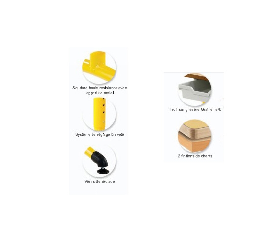 Piètement à dégagement latéral avec semelle cintrée en tube de diamètre 35 épaisseur.: 1,5 mm et montant de diamètre 45 d'une épaisseur de 2 mm, cadre soudé sous plateau en tube 50/20 d'une épaisseur de 1,2 mm; revêtu époxy. Roulettes (en option) de 7,5cm de hauteur. Barre de renfort sous le plateau (non visible sur touts les photos).