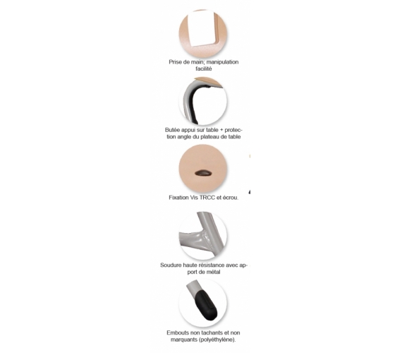 Embouts coiffant à l’avant et embouts anti bascule à l’arrière ainsi que 4 butées de protection sous l’assise; non tachant, non marquant (polyéthylène).
