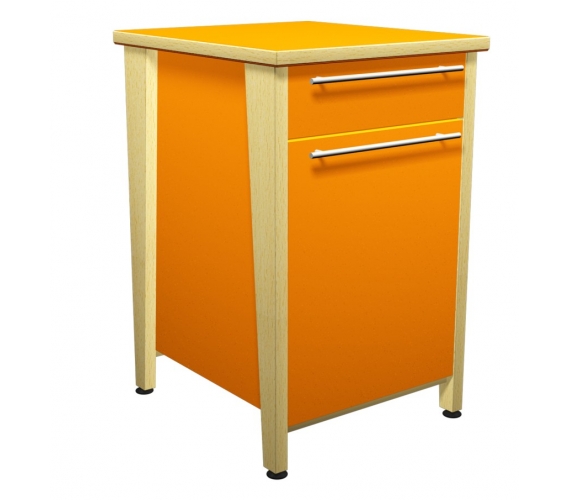 Dimensions hors tout : H 900 x P 550 x L 550 mm. Structure réalisée en hêtre massif. La porte et les facades sont réalisés en mélaminé de 19 mm avec montant massif . Les arêtes du produit sont cassées par un arrondi. Finition vernis polyurétane. Plateau du dessus en aggloméré de 22 mm, stratifié et contrebalancé d’épaisseur 22 mm. Assemblage par vis.