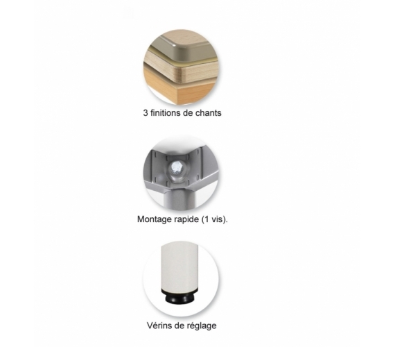 Hauteur d’utilisation : T1, T2, T3, T4, T5 et T6 norme européenne NF EN 1729. Tables à 4 pieds démontables; montage des pieds très rapide avec seulement 1 vis par pieds.