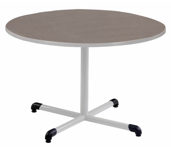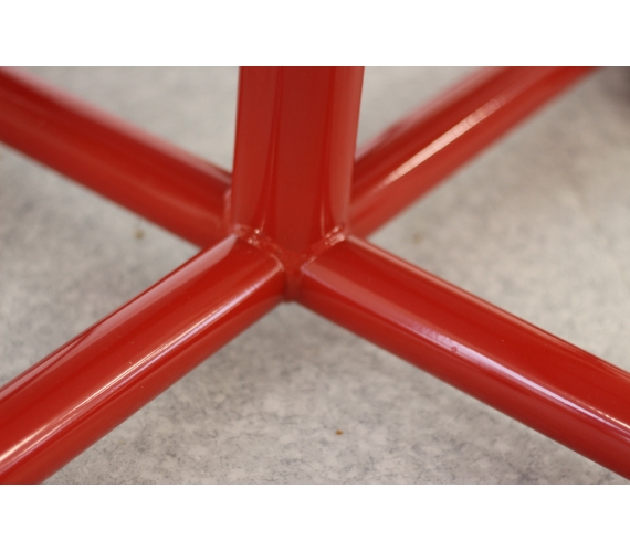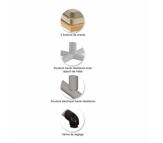 Piètement central avec semelle droite en tube de diamètre 45 et d'épaisseur: 2 mm et montant de diamètre 60 et d'épaisseur : 2 mm (table de diamètre 120); Piètement à dégagement latéral avec semelle droite et montant en tube de diamètre 45 et d'épaiseur: 2 mm, cadre soudé sous plateau en tube 50/20 d'épaisseur: 1,2 mm; revêtu époxy.