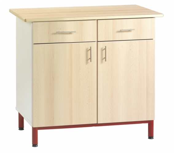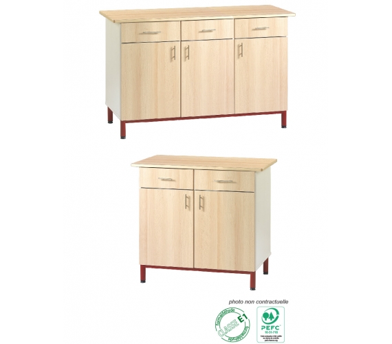 Structure du meuble en mélaminé d'épaisseur: 19 mm; avec séparations. Assemblage de la structure par tourillons collés. 1 tablette réglable (par pas de 32 mm) dans chaque rangement. 2 ou 3 tiroirs montés sur coulisses métalliques avec poignées métallique