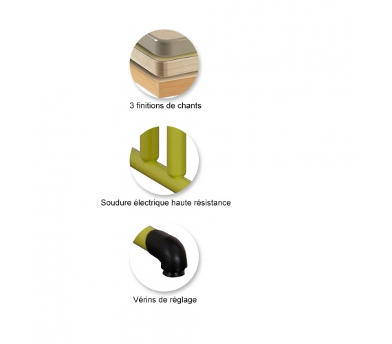 Plateau disponible en ép. : 24 mm, disponible en stratifié chant polypropylène (PP) de 2 mm; ou chant alaise bois; ou chant P.U; et stratifié antibruit chant alaise bois (réduction du niveau sonore de -7 à -10 décibels en moyenne) ou SOFTOP® (réduction du niveau sonore de -16 à -26 décibels en moyenne) chant polyuréthane (P.U) selon format.