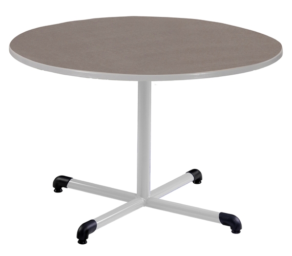 Piètement central avec semelle droite en tube diamètre 45, épaisseur: 2 mm et montant diamètre 60, épaisseur : 2 mm (table diamètre 120); Piètement à dégagement latéral avec semelle droite et montant en tube diamètre 45, épaisseur: 2 mm, cadre soudé sous plateau en tube 50/20, épaisseur: 1,2 mm; revêtu époxy.