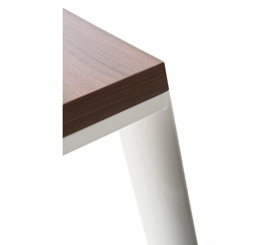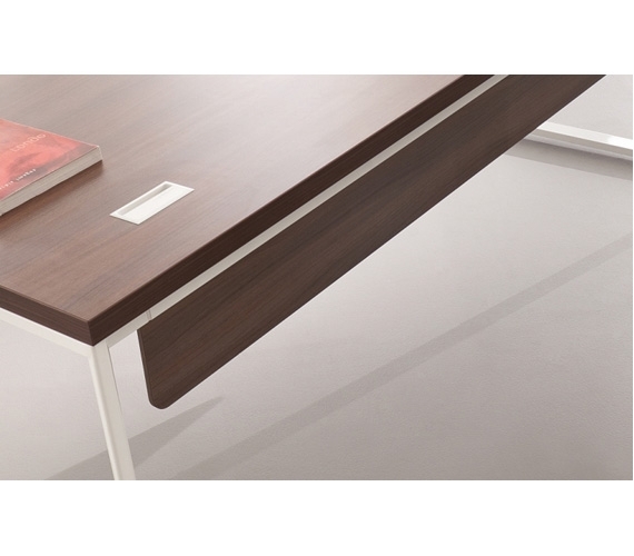 Plateaux Stratifié, épaisseur 36 mm, chant ABS plaqué 2 mm. Passe-câbles intégrés (pour les plateaux Stratifié). Structure en acier peint époxy, composée de 2 poutres reliant les piétements elliptiques. Embase horizontale équipée de vérins de réglage.