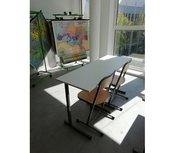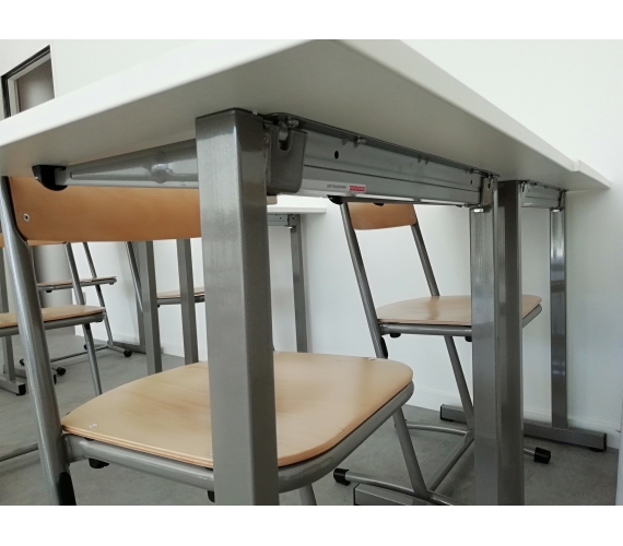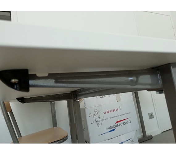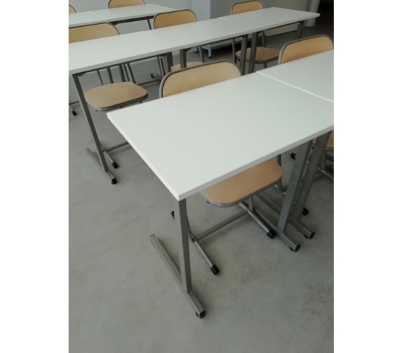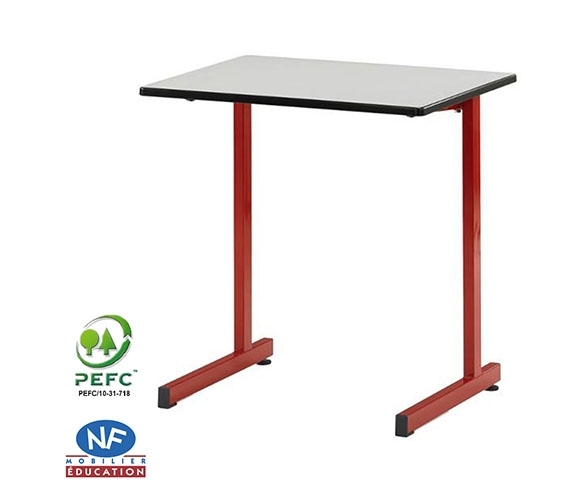 Produit certifié NF éducation. Hauteur d’utilisation : T4, T5 et T6 norme européenne NF EN 1729. Table à dégagement latéral; montage rapide : seulement 2 vis. (Option : casier tôle à visser gris 7037 et/ou crochets porte cartables).
