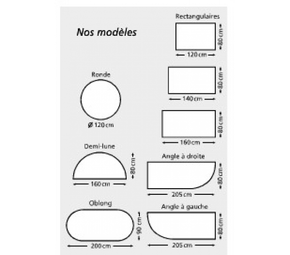 Dimesnsions: 120x80, 140x80, 160x80, Ovale 200x90, Ronde D120, demi-ronde D160cm, Angle.