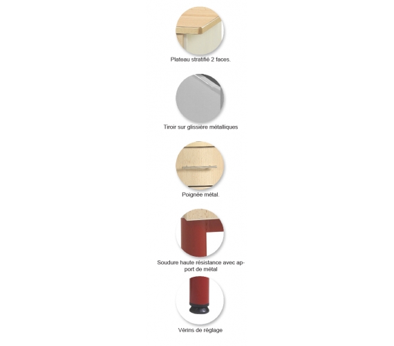 Piètement en tube de diamètre 40 et d'épaisseur.: 1,5 mm; cadre soudé en tube 50/20 épaisseur.: 1,2 mm; revêtu époxy.