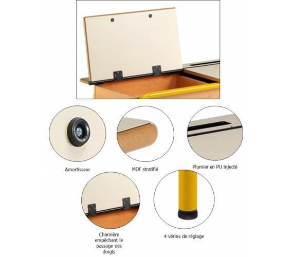 Plateau MDF avec 2 faces stratifiées chants vernis naturel ; casier mélaminé d'épaisseur de 19 mm aulne naturel chants polypropylène (PP) épaisseur de 2 mm. Casier avec charnière sur toute la longueur du plateau empêchant le passage et le pincement des doigts. Plumier en PU injecté. Système de fermeture du plateau avec amortisseurs réduisant le bruit et évitant le pincement des doigts. Dim utile des casiers (L/P/H) 550 x 350 x 130 mm.