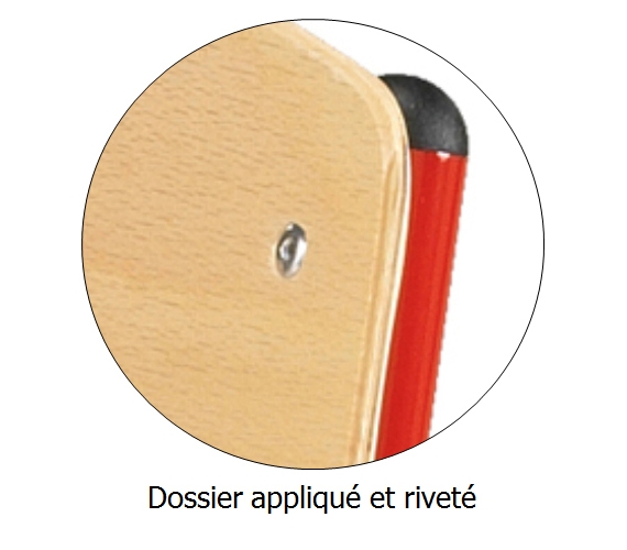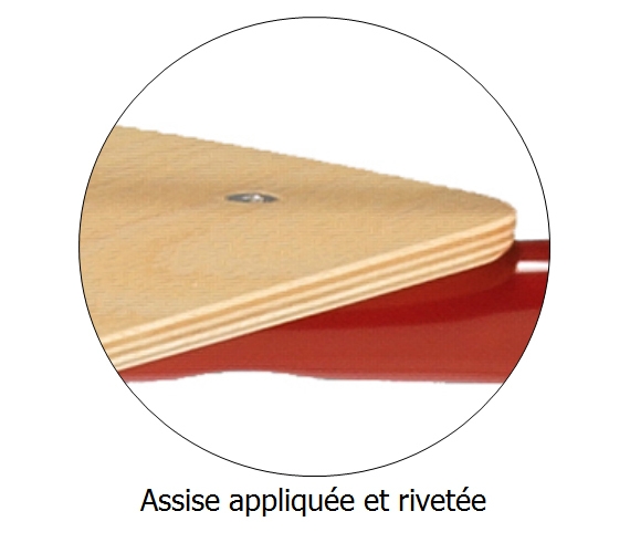 Assise bombée d'une épaisseur de 8 mm et dossier appliqué d'une épaisseur de 7 mm en multiplis hêtre. L'assise et le dossier sont rivetés à la structure métallique, finition verni polyuréthane.