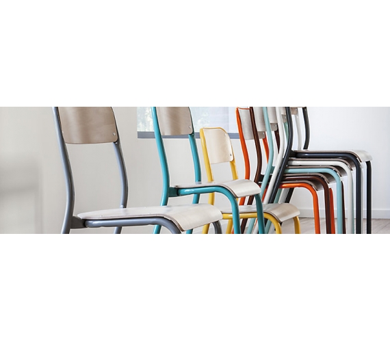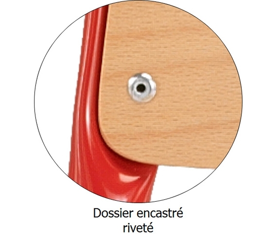 Assise bombée d'une épaisseur de 8 mm et dossier appliqué d'une épaisseur de 7 mm en multiplis hêtre. L'assise et le dossier sont rivetés à la structure métallique, finition verni polyuréthane.