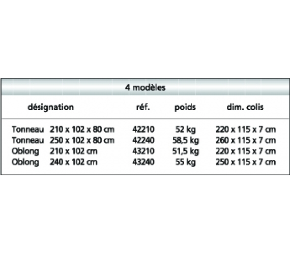Dims: L240xL120, L300xP120, L300xP140, L360xP120, L360xP140cm