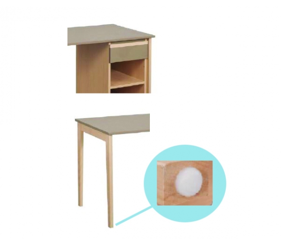 Les arêtes du produit sont cassées par un arrondi. Le plateau et le caisson sont en panneaux mélaminés