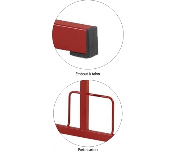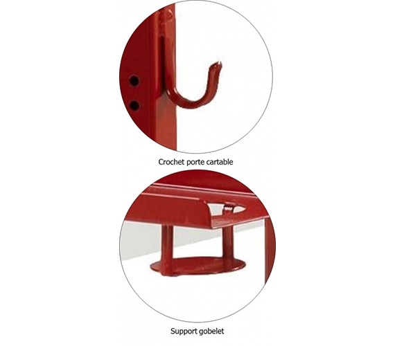Equipé par un support godet amovible, pouvant être mis à droite ou à gauche de la table, d’un crochet porte cartable et d’un porte carton; revêtu époxy. Piétement en tube 40/27 épaisseur: 1,5 mm.