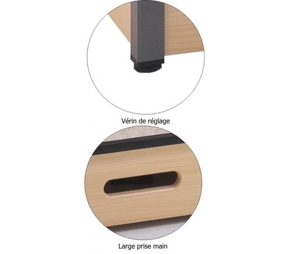 Dessus ép.: 21 mm avec un revêtement antichoc (plastique) ou antidérapant chants polypropylène (PP); Côté en pin massif ép. 19 mm; finition verni polyuréthane.